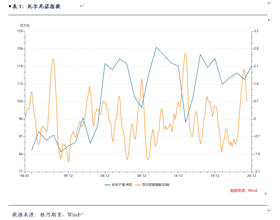 厄尔尼诺指数高往往对应着棉花产量的下降,现在厄尔尼诺指数下降明显但未形成拉尼娜,北半球主产棉区新棉生长期一般到9-10月份就结束了,从目前来看拉尼娜预计在这段时间之前完全形成的概率不大,目前气候仍比较适宜棉花生长,预计今年棉花丰产的概率较大。