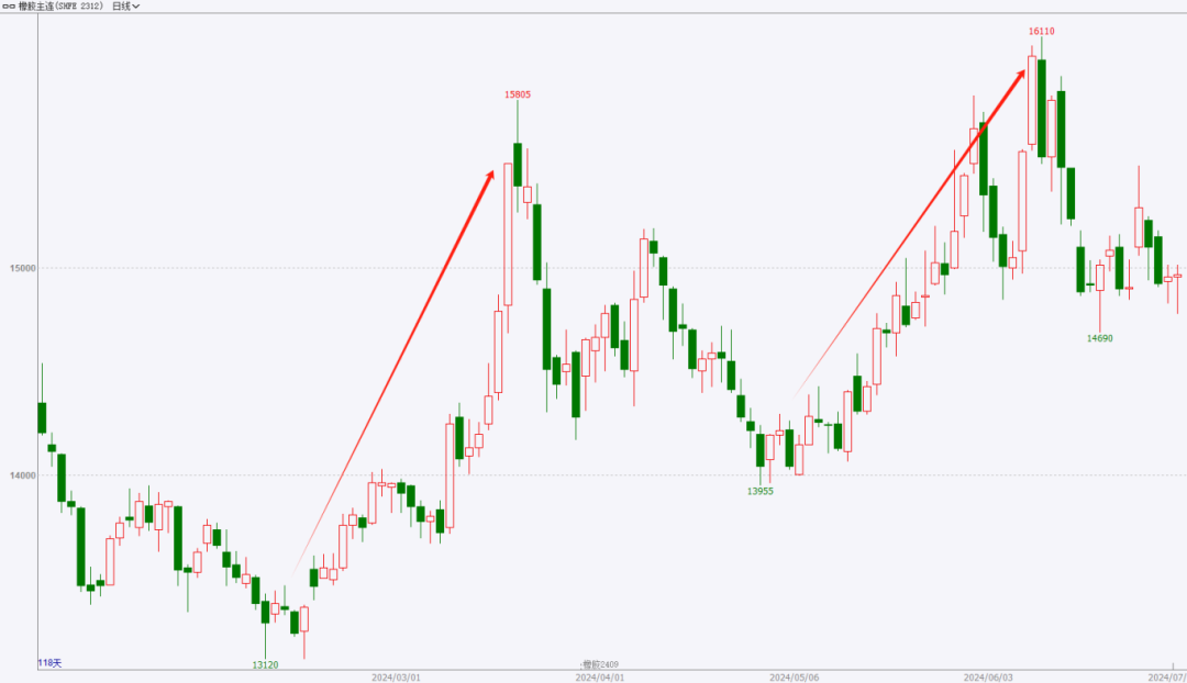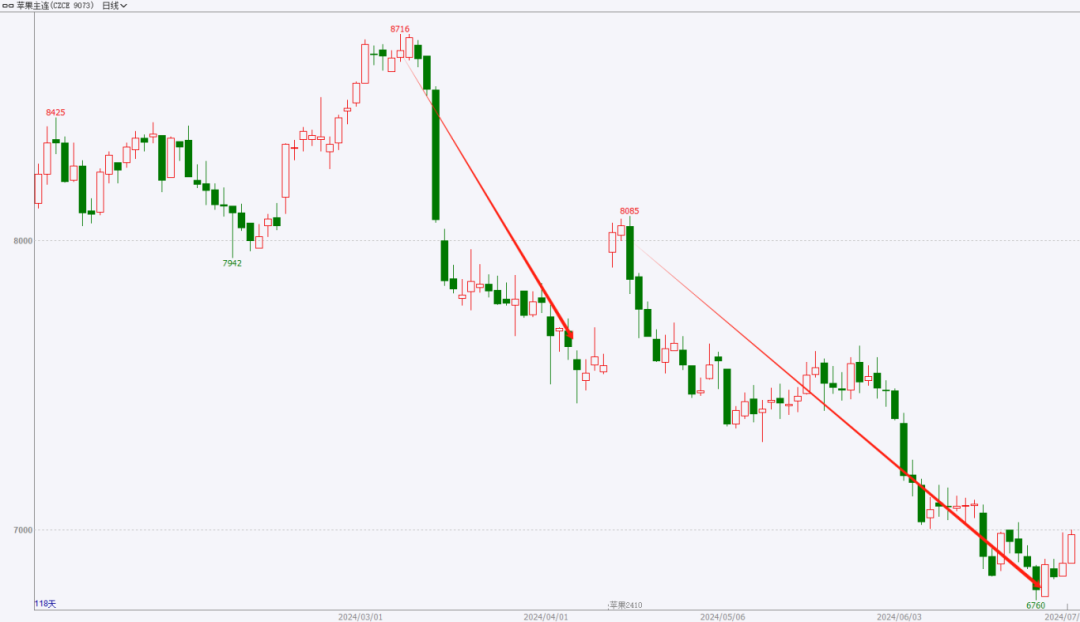 行情回顾:年初,由于天气因素的影响,苹果产量预期减少,市场对未来供应的担忧加剧。这种担忧情绪迅速传导至期货市场,推动期货价格快速上涨。在期货价格的带动下,苹果现货市场也开始跟涨,市场交投活跃。然而,随着春季的到来,苹果产区逐渐进入开花期,天气逐渐转暖,市场对苹果产量减少的预期逐渐减弱。这使得期货价格开始回调,市场交投热情也随之降温。进入二季度,苹果市场进入消费淡季,市场需求减弱。同时,随着新季苹果的套袋工作完成,市场对今年苹果产量的预估逐渐明确,市场预期产量将高于去年。这一预期导致期货价格进一步下跌。此外,交割品质放宽因素也对苹果价格产生了负面影响,使得价格跌幅再次扩大。