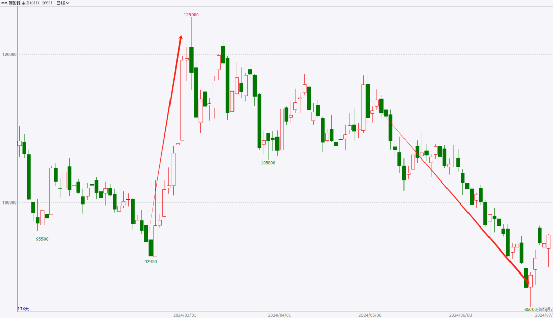 行情回顾:2024年上半年,碳酸锂市场经历了显著波动。年初,受新能源汽车补贴政策退坡、磷酸铁锂市场份额增加等因素影响,碳酸锂需求预期减弱,市场对未来供应的担忧加剧。这种担忧情绪迅速传导至期货市场,推动碳酸锂期货价格快速下跌。然而,在2月底至3月初,市场出现了一次短暂的反弹。反弹主要受到市场情绪的影响和供需关系的变化。市场短线利好消息不断发酵,如减产、检修、环保等供给端的利好,以及需求端如排产大幅提升、消费品以旧换新等利好。期货与现货市场均对此作出了积极反应,市场给予需求旺季的二季度合约一定升水,造成短期内现货紧缺。然而,随着供应端的产能扩张与需求端的疲软双重压力,碳酸锂价格随后继续下跌。尽管有短暂的反弹,但企业大范围减产趋势难以形成,市场依旧弱势运行。