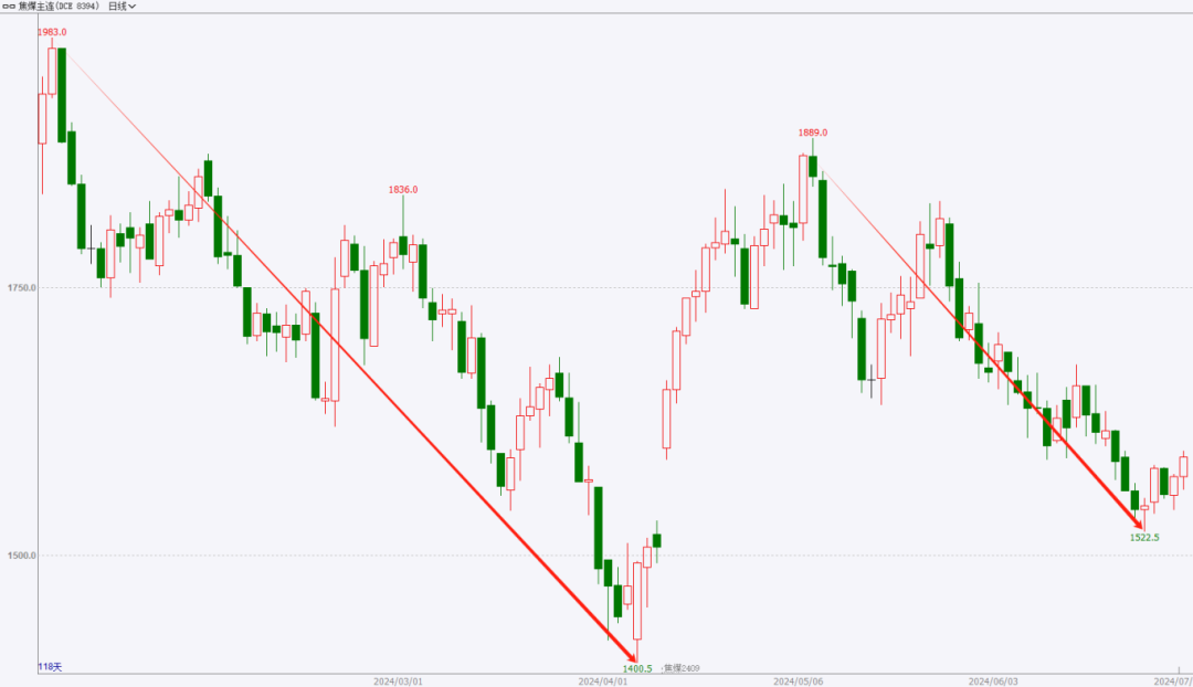 行情回顾:上半年,焦煤价格总体呈现震荡下行态势。在一季度,由于焦煤产量显著收缩,需求也出现了明显的下滑。下游钢厂复产的进度不如预期,因此主动减少了原料库存,这种负反馈机制导致焦煤价格持续走低。然而,进入第二季度,钢厂的原料库存降至低位,铁水产量有所回升,补库需求推动了焦煤价格的反弹。随着钢厂逐步恢复正常生产,煤矿也加快了复产步伐,供需关系基本保持平衡,但期货市场整体表现依然弱势,焦煤价格呈现震荡下行趋势。