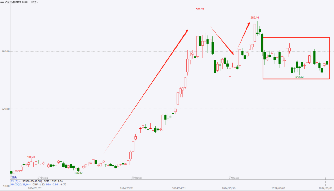 行情回顾:上半年,黄金价格在美联储政策的主导下,整体呈现波动上扬的态势。年初至3月份,市场对于美联储降息的预期逐渐与官方立场趋同,这种预期差的缩小吸引了众多海外投机资本的涌入,进而推动黄金价格在3月份冲破前期高点。踏入第二季度,尽管降息的预期影响开始减弱,但地缘政治局势的紧张升级,尤其是中东地区冲突的可能扩大,激发了全球市场的避险情绪。这一情绪的转变对黄金价格形成了强有力的支撑,使其在复杂的国际环境中保持了相对坚挺的走势。进入6月份,美联储的货币政策立场出现转向,表现出更为鹰派的态度。市场对加息的预期随之增强,这在一定程度上对黄金价格的进一步上涨构成了压力。