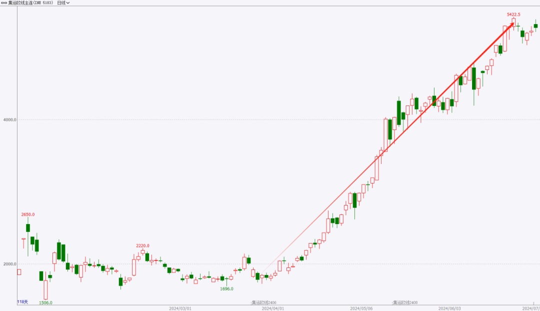 行情回顾:自2023年10月以来,受巴以冲突、海上紧张局势升级、欧洲四大集装箱航运巨头暂停服务以及地缘风险不断加剧等多重因素影响,运价中枢呈现上升趋势。2024年一季度,随着紧张情绪的逐渐减弱和春节期间的集中出货,高运价难以持续维持,出现了回落态势。然而,随着亚洲至欧洲FAK费率的提涨,运价开始止跌回升。进入二季度,欧美国家纷纷提前启动补库周期,加之地缘冲突不断升级及船公司常态化绕航导致的阶段性运力短缺,使得现货运价持续上涨。此外,港口堵塞的问题持续存在,严重影响了航运效率,进一步助推了运价的上涨。