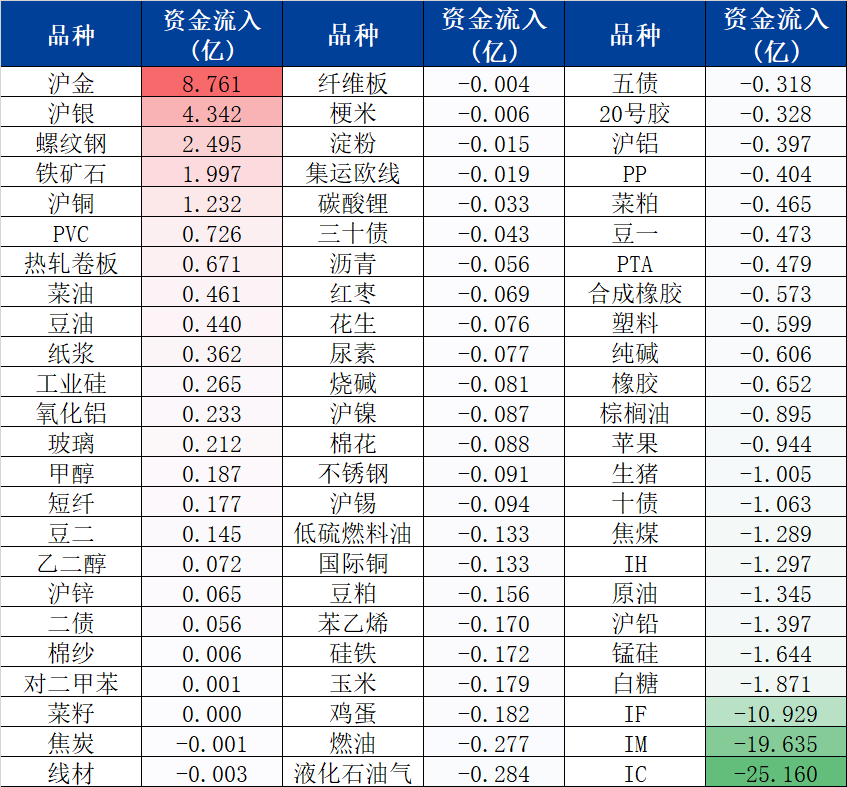 资金流入前三名为沪金、沪银和螺纹钢;流出前三名分别为IC、IM和IF。