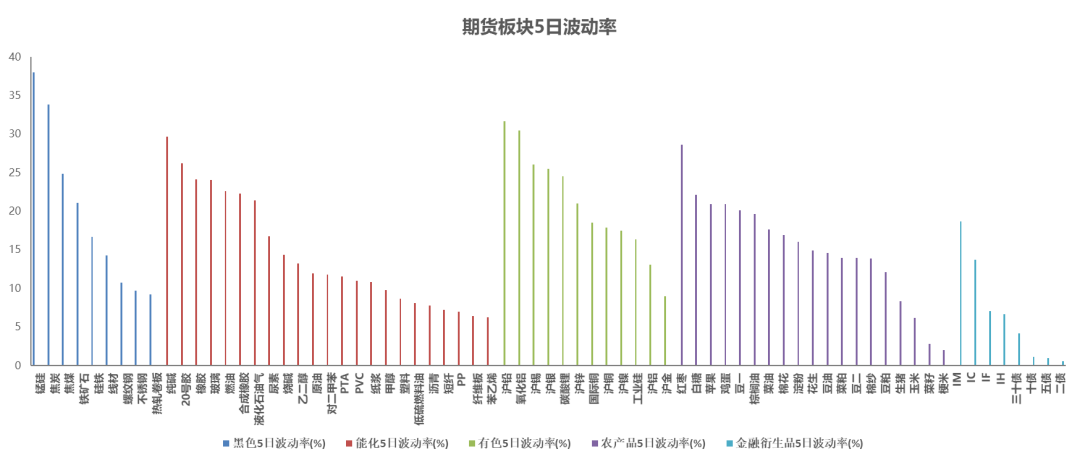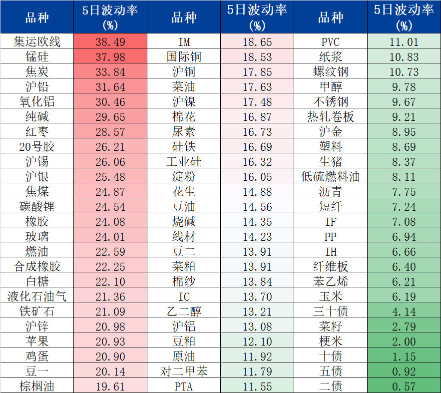 从5日波动率水平看,前三位为集运欧线、锰硅和焦炭;低波动前三品种为二债、五债和十债。