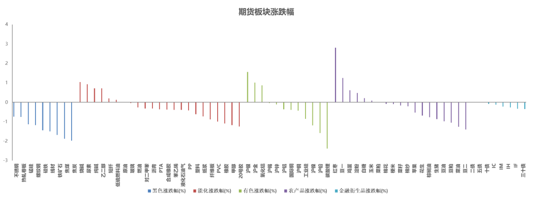从板块整体表现看,农产品、有色部分上涨,黑色、金融衍生品多数下跌。