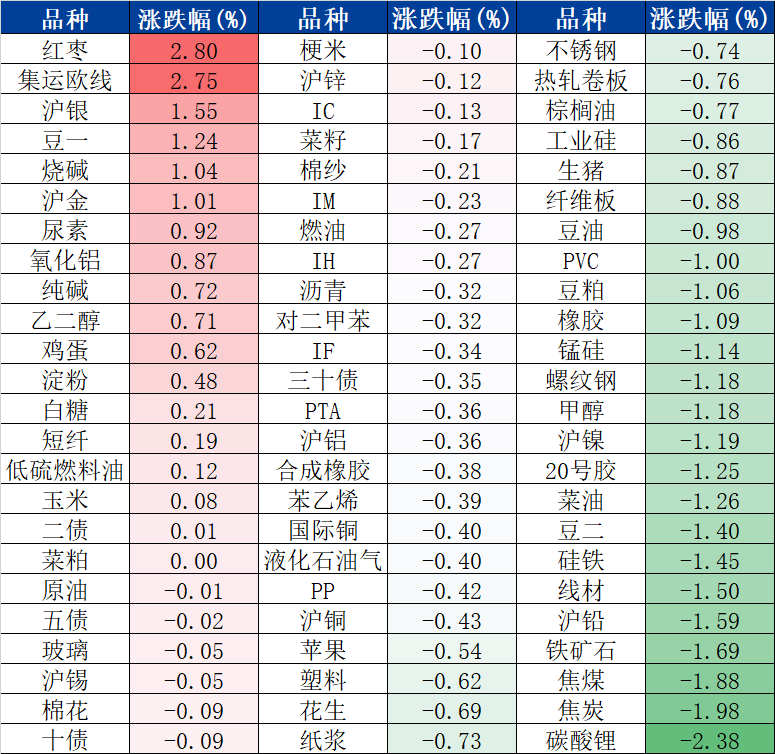 涨幅居前的三个品种分别是红枣、集运欧线和沪银;跌幅居前的是碳酸锂、焦碳和焦煤。