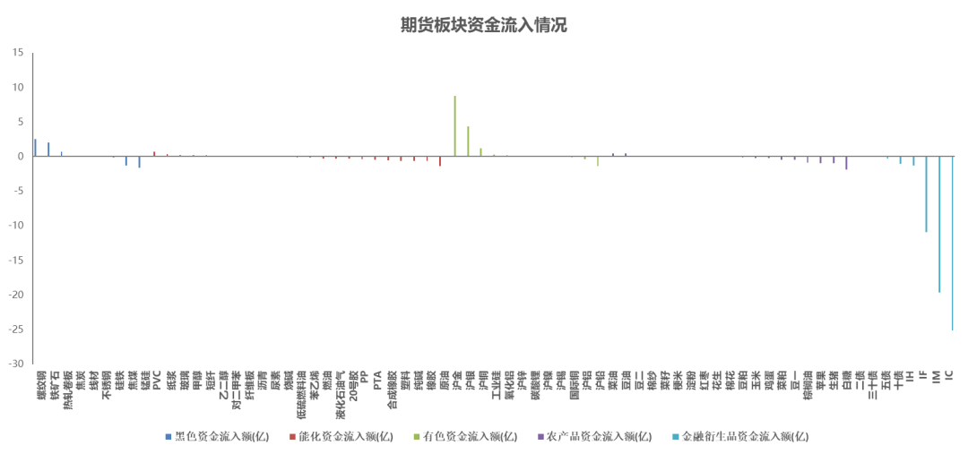 从板块资金流动情况来看,有色、黑色部分流入,股指、国债多数流出。