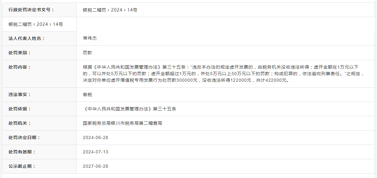 金融界消息,近日,宁夏鑫隆伟业石油化工有限公司因偷税,被国家税务总局银川市税务局第二稽查局罚款300000元,没收违法所得122000元,共计422000元。