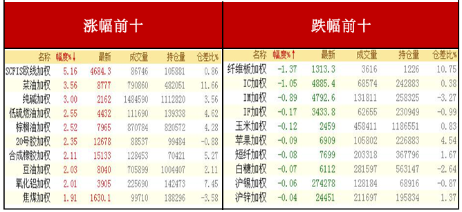 能化品多数上涨,据分析,国内纯碱个别企业检修或设备不正常,产量及开工下降。月底或月初,企业接单中,有企业反馈订单有所提振。纯碱周产处于历史较高位,供需刚性过剩,企业库存属于增加趋势,个别企业增加明显。但是当前纯碱市场充斥着各种谣言,市场情绪化比较严重,基本面数据相对市场走势基本处于失效状态,纯碱涨逾3%,低硫燃料油、20号胶涨逾2%;