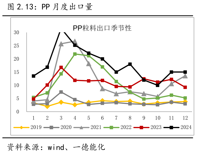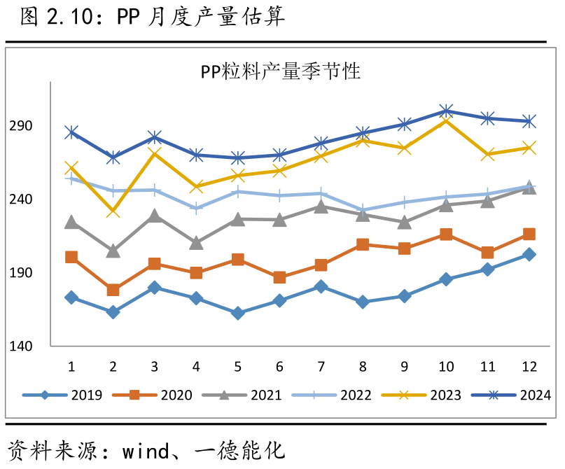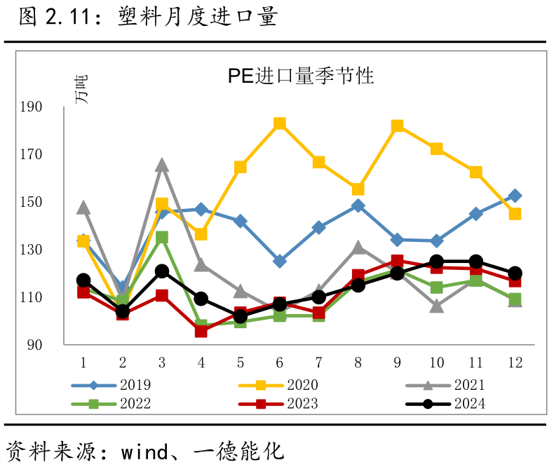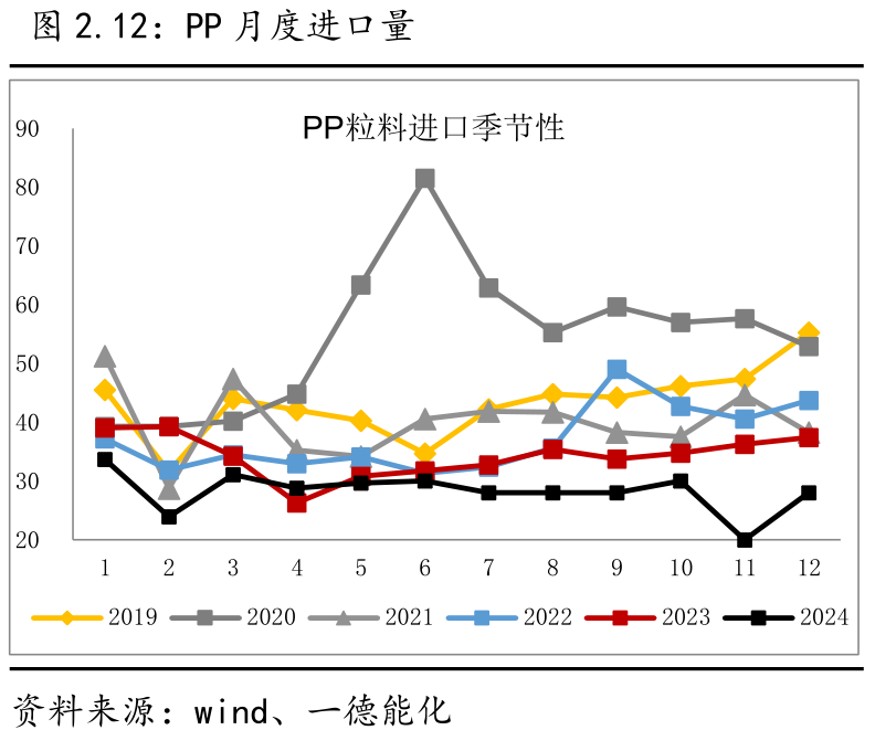 上半年塑料表需累计同比增速预计2.6%左右,低于去年同期的3.5%增速,其中国产量累计接近1400万吨,较去年增加仅20万吨左右,累计同比增幅1.5%,主要是没有新增产能的释放;进口累计量同比增加4%,出口量与去年基本持平。PP上半年表需累计同比增速预计2%,低于去年同期的5%,其中产量累计约1640万吨,较去年增加110-120万吨,而进口累计减少12%,出口增幅明显,预估上半年的出口量接近去年全年的出口量(130万吨左右),随着PP国内投产的进一步兑现,对外依存度会继续下滑,甚至出现当月出口超过进口的情况。三季度是检修恢复期,也是下半年传统旺季的开启阶段,供增双增继续博弈。