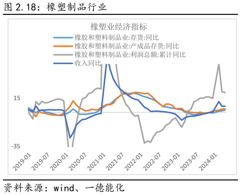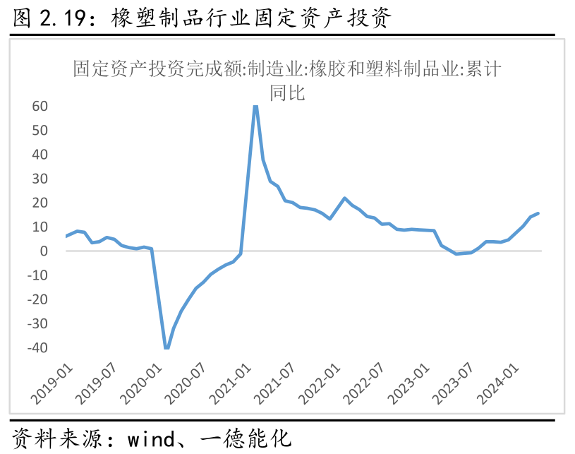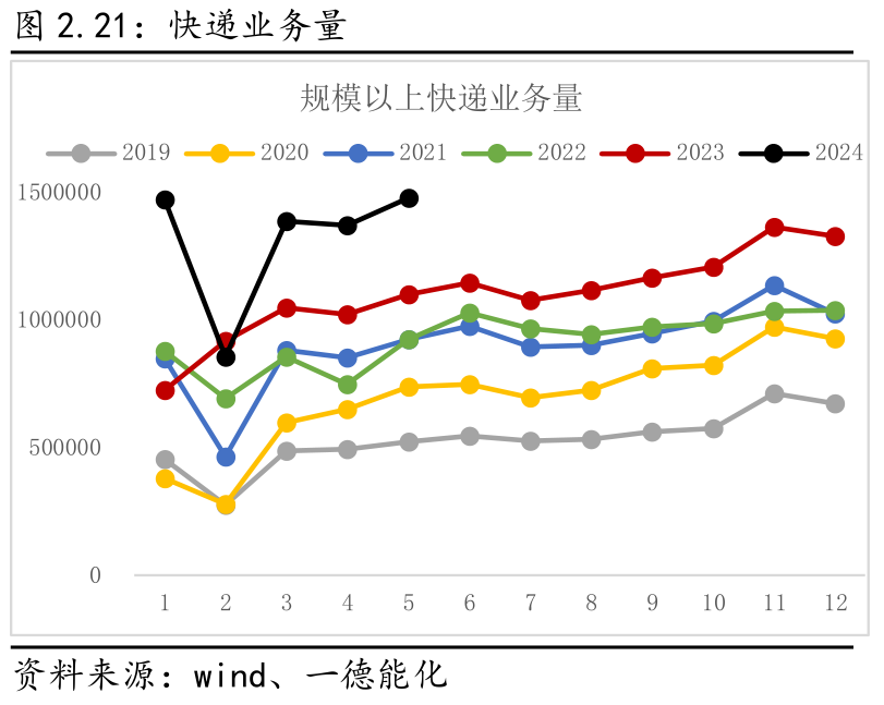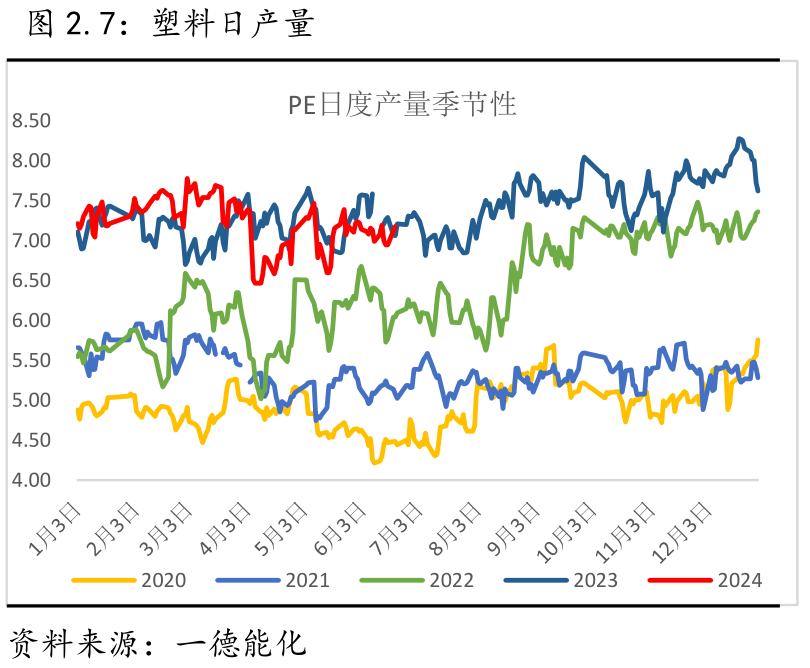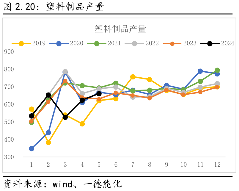 具体到聚烯烃的终端需求,橡塑行业的固定资产投资完成额累计同比提升到14%,中短期看产成品存货同比增加3.6%,利润累计同比增加20.7%。1-5月塑料制品产量累计同比增长2.3%,塑料制品出口金额累计增速2.5,略高于去年同期但远不及前几年的高增速,长期看出口市场难有明显改善。快递业务量1-5月累计同比增长24.4%,该增速高于2022-2023年的同期水平。