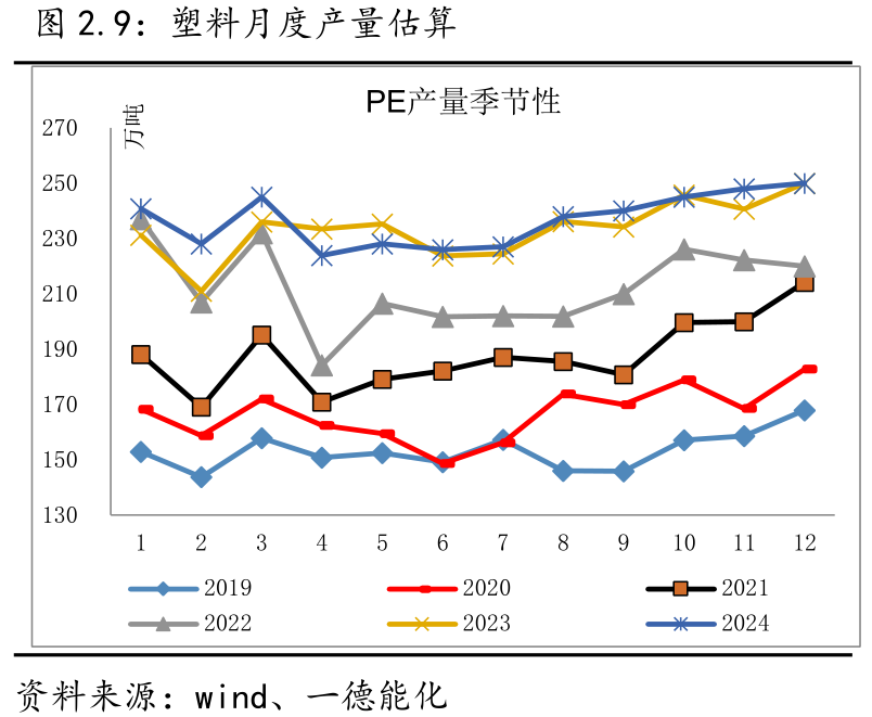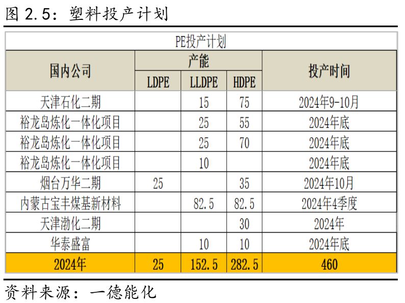 塑料今年计划投产460万吨,其中包含高压25万吨,线性152万吨以及低压283万吨,时间节点多数在四季度,不排除延期到明年的可能。