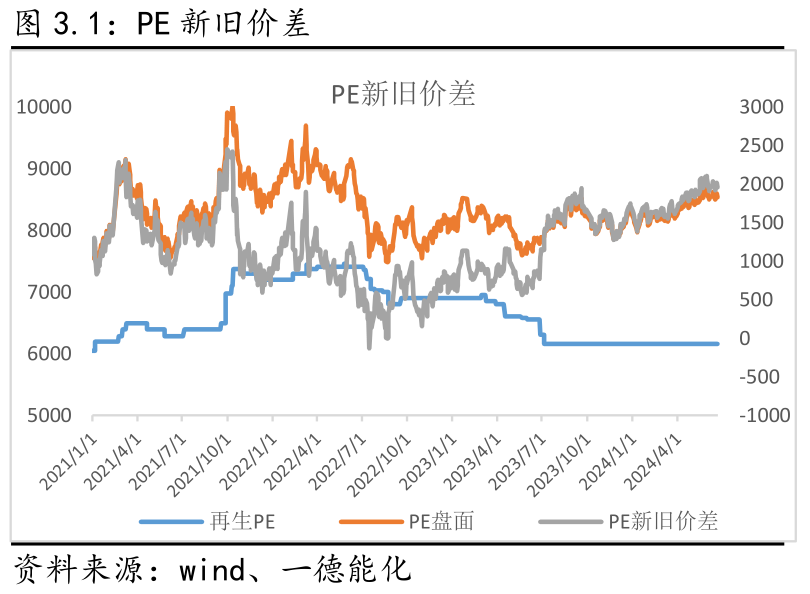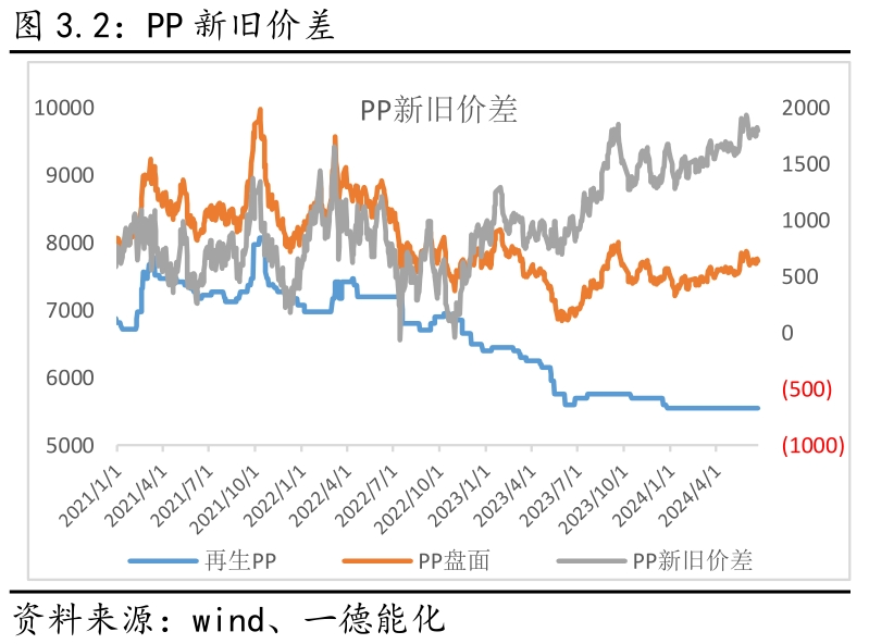 聚烯烃的估值高低除了看生产利润率,其次是看相对价格。再生料的价格波动相对小,可以作为强支撑,历史上看新旧价差波动区间在0-2000,目前分别在2000/1800附近,即处于偏高水平。