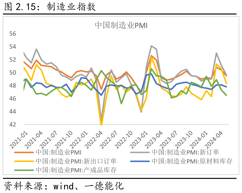出口市场长期受国际形势的影响,且全球经济增速放缓,1-5月出口金额累计同比增速2.7%好于前两年,但制造业PMI中新出口订单从50.6%降至48.3%。投资由往年的房地产市场转变为重点行业设备、建筑和市政基础设施领域设备、交通运输设备和老旧农业机械、教育医疗设备等更新改造,辅助性的扩大内需。