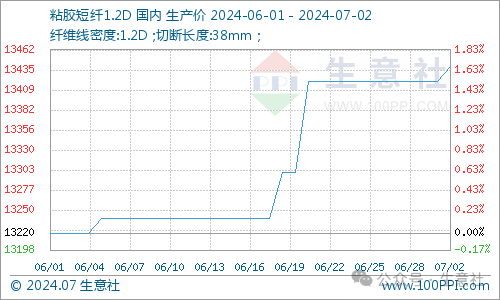 据生意社商品行情分析系统,6月以来,粘胶短纤价格震荡上涨。截止目前,1.2D*38mm粘胶短纤国内地区出厂报价为13440元/吨,较6月初价格13220元/吨上涨1.66%。