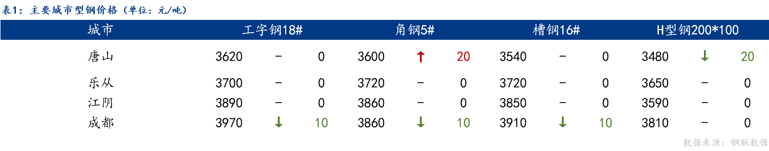 今日型钢价格主稳运行,唐山角钢价格较上一交易日上涨20元/吨,唐山H型钢价格较上一交易日下跌20元/吨;成都工字钢、角钢、槽钢价格较上一交易日下跌10元/吨。