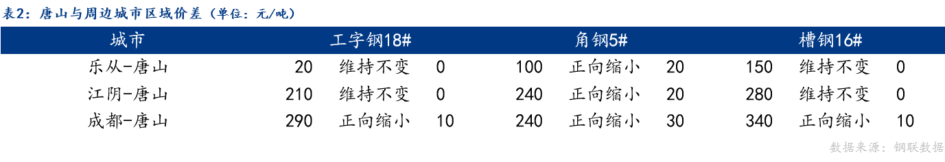 从区域价差来看,乐从江阴成都角钢与唐山角钢价差正向缩小,成都工字钢槽钢与唐山工字钢槽钢价差正向缩小。