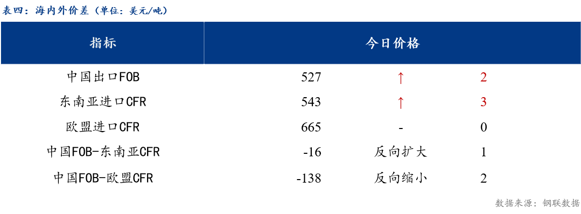 从海内外价差情况来看,中国热卷出口在527美元/吨,较上一交易日上涨2美元/吨;欧盟进口价格665美元/吨,较上一交易日持平。