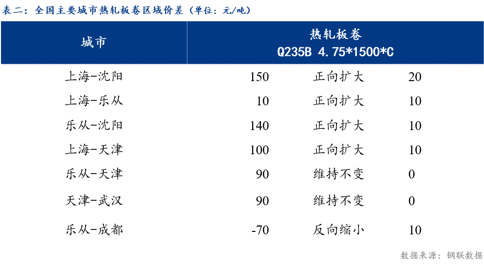 从区域价差来看,华东与东北价差150元/吨,较上一交易日正向扩大20元/吨;华东与华南价差10元/吨,较上一交易日正向扩大10元/吨;华南与华北价差为90元/吨,较上一交易日持平。