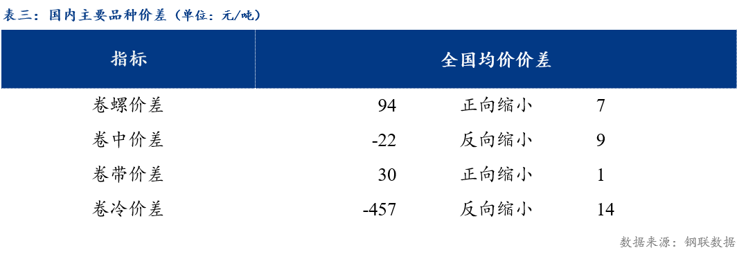 从品种价差来看,卷螺价差为94元/吨,较上一日正向缩小7元/吨;热中价差为-22元/吨,较上一交易日反向缩小9元/吨;热带价差为30元/吨,较上一交易日正向缩小1元/吨;热冷价差较上一交易日反向缩小14元/吨 。