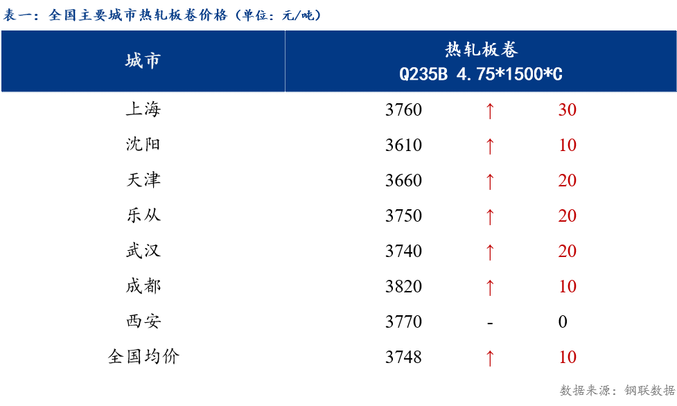 今日热轧板卷全国主要城市价格小幅上涨,截止发稿时3.0mm热轧板卷全国均价3810元/吨,较上个交易日上涨11元/吨。4.75mm热轧板卷全国均价3749元/吨,较上个交易日上涨11元/吨。今日黑色商品期货震荡上行,10合约收涨1.20%,早盘市场报价以稳为主,现货成交尚可;午后期货持续上行,带动市场情绪,现货价格上涨,但涨后成交一般,对高价接受程度偏弱。