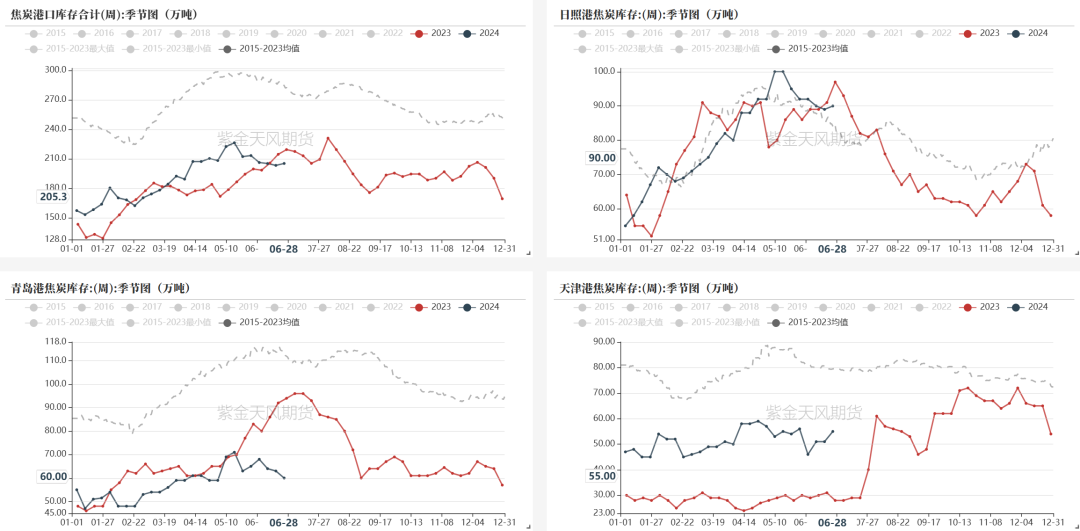 焦炭港口库存205.3万吨,周环比+1.9万吨。