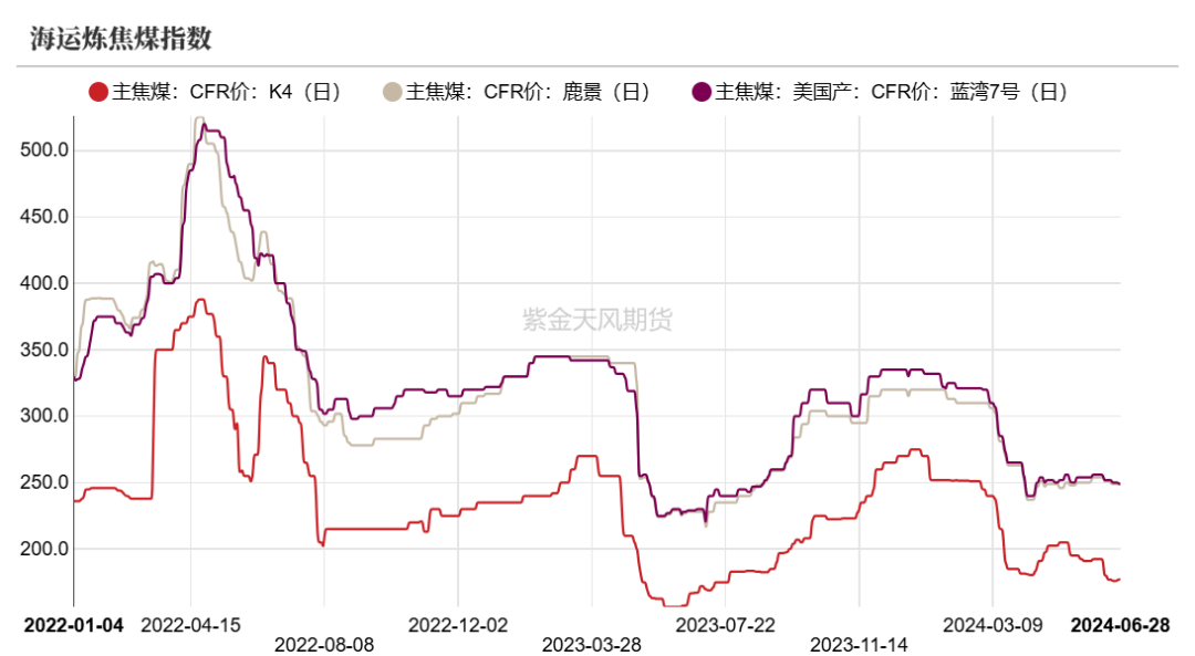 澳洲Grosvenor矿受火灾事故影响较大,澳洲准一线焦煤报价跳涨20元/吨左右幅度,有贸易商高价接货,但需求端整体仍较弱势,目前澳洲峰景矿报价上涨至273美元/吨;俄罗斯主焦煤K4报价震荡运行177.5美元/吨。