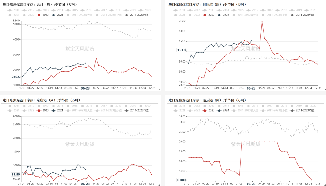 进口炼焦煤港口库存246.5万吨,周环比+12万吨。