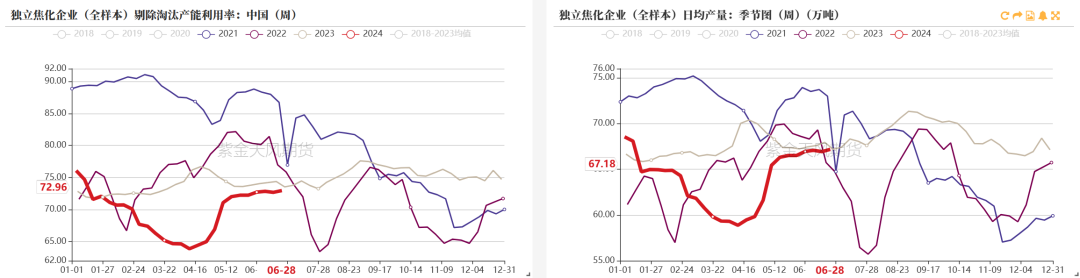 独立焦化企业(全样本)剔除淘汰产能利用率72.96%,周环比+0.28%;