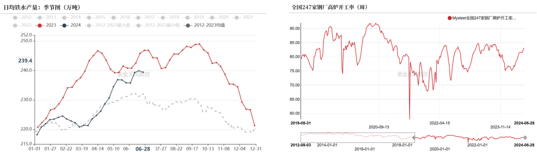 247家钢厂铁水日均产量239.4万吨,周环比-0.5万吨;247家钢厂高炉开工率83.11%,周环比+0.3%;