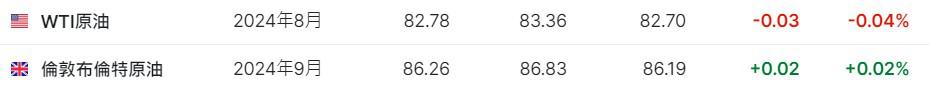 3.截至发稿,WTI原油跌0.04%,报82.78美元/桶。布伦特原油涨0.02%,报86.26美元/桶。