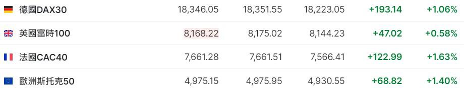 2.截至发稿,德国DAX指数跌1.06%,英国富时100指数涨0.58%,法国CAC40指数涨1.63%,欧洲斯托克50指数涨1.40%。