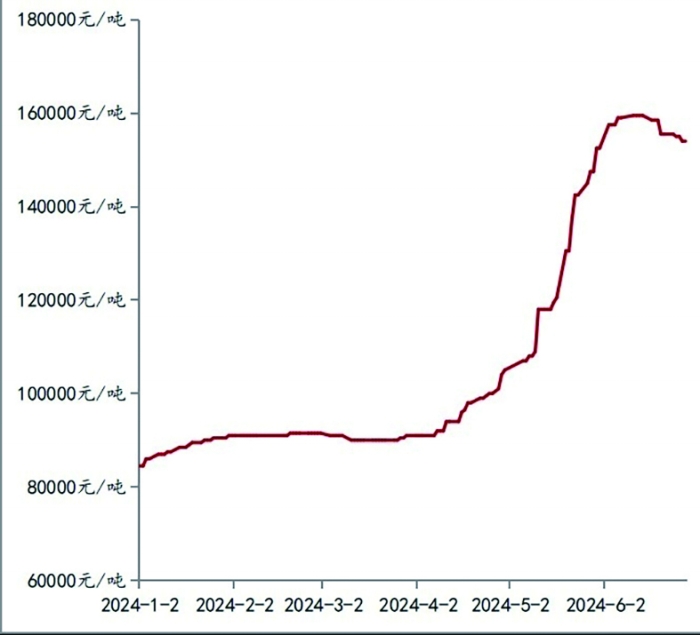 上海钢联数据显示,2024年上半年锑金属价格大涨,居有色板块前列。6月28日,1号锑锭价格为154000元/吨,较年初上涨82.2%。