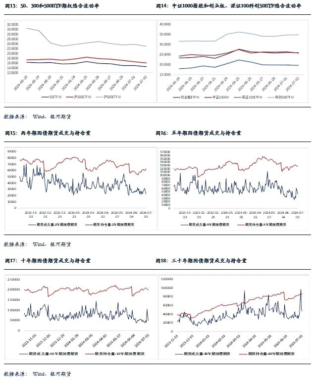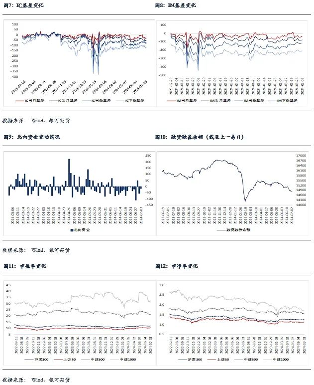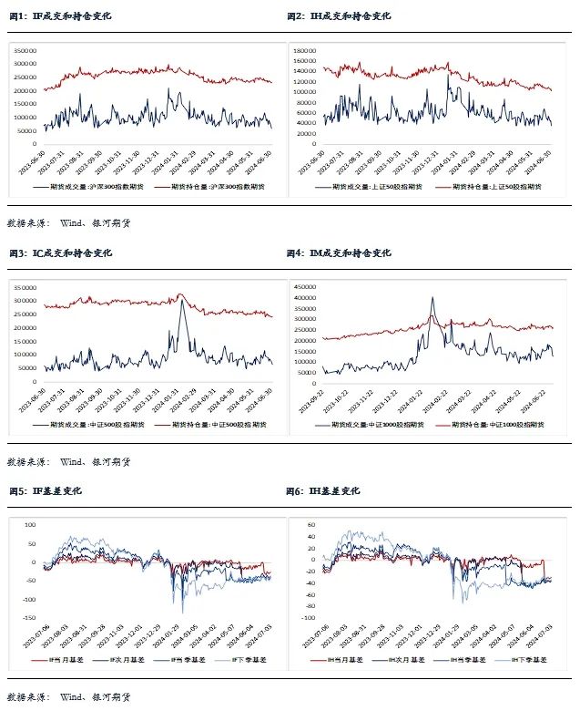 股指期货方面,主力合约跟随现货市场回落,至收盘,IH2407跌0.02%,IF2407跌0.2%,IC2407跌0.85%,IM2407跌0.59%。期货跌幅略强于现货,各品种基差小幅上行,贴水略有缩小。IC、IF、IH和IM的成交量和持仓量均出现不同程度的下降或增长。