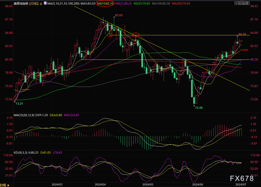 技术面来看,美原油短线偏向高位震荡筑顶,留意82.10-84.46区域突破情况,前者是10日均线支撑,后者是4月26日高点阻力。