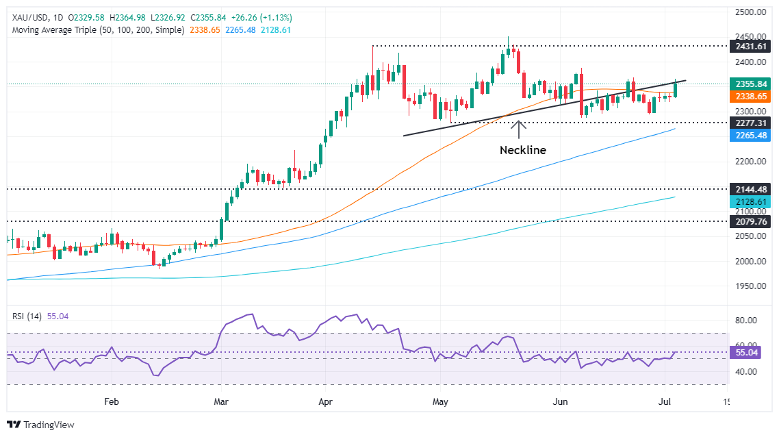 FXStreet分析师Christian Borjon Valencia指出,黄金价格的上升趋势将继续,并正在测试自2024年4月以来出现的头肩形态颈线。