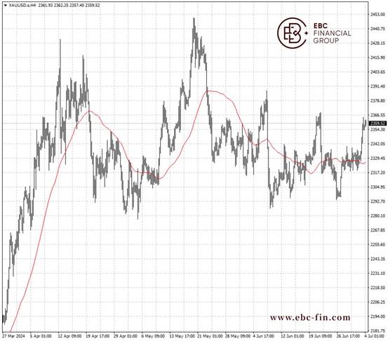 周四(7月4日)黄金在近2周附近徘徊,最近数据显示劳动市场松动,使得美联储9月降息概率上升。