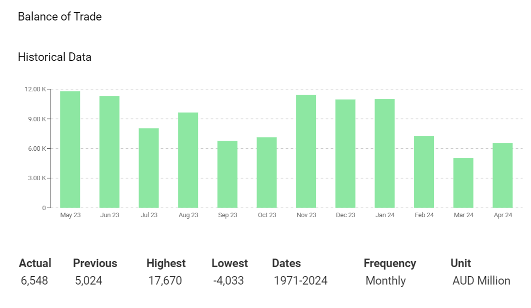 作为背景,澳大利亚的贸易顺差在过去12个月中呈下降趋势。2023年5月,贸易顺差为117.91亿澳元,随后在2024年3月降至12个月低点50.24亿澳元。