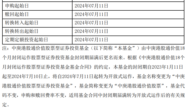 7月4日,中庚基金公告称,中庚港股通价值18个月封闭股票基金将于7月11日开放日常申购、赎回、转换、定期定额投资业务。