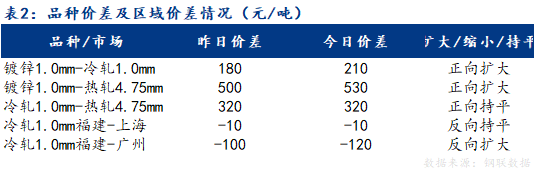 福建市场品种价差来看,镀冷品种今日价差210元/吨,较昨日正向扩大;镀热价差530元/吨,较昨日正向扩大,冷热价差320元/吨,较昨日正向持平。区域价差来看,冷轧品种,福州-上海市场价差10元/吨,较昨日反向持平;福州-广州市场今日价差120元/吨,较昨日反向扩大。