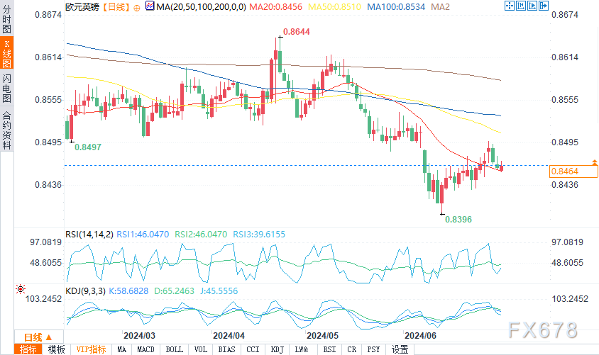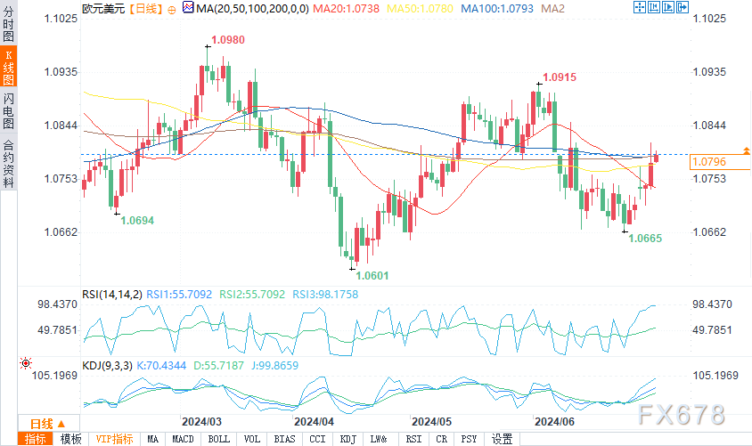 欧元/美元在1.06-1.09区间波动。欧洲央行领先的降息周期、强劲的美国5月份就业数据以及欧洲选举中的右翼倾向,将该货币对从1.09高位往下拉。美联储会议平衡了弱于预期的美国CPI结果。第一轮投票后,法国议会出现无多数席位的可能性增加,这让欧元松了一口气。