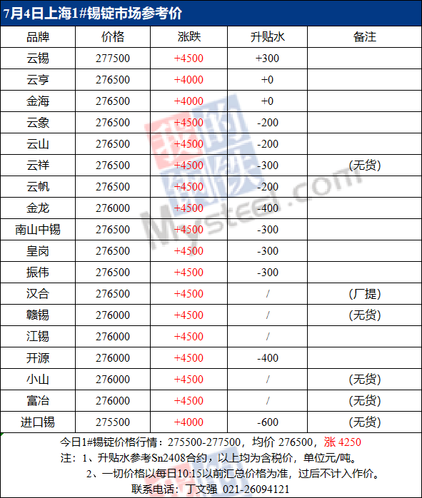 7月4日Mysteel上海现货锡锭报价275500-277500元/吨,均价276500元/吨,较上一交易日涨4250元/吨,Mysteel15:30上海现货锡锭成交价格273500-275500元/吨,均价274500元/吨,较上一交易日涨1500元/吨。