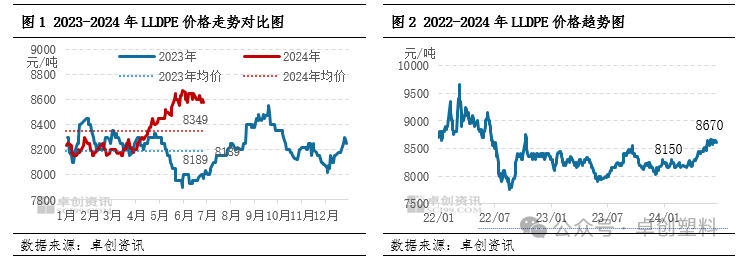 2024年上半年国内LLDPE市场整体呈弱势震荡后逐渐拉涨的趋势,其走势与我们在《2023-2024中国LLDPE市场年度报告》中预测有所相悖,上半年国内PE市场在检修多供应少、原油价格持续走高等因素的影响下,二季度开始行情连续上涨。截止到2024年6月份,国内LLDPE均价在8349元/吨,较去年同期上涨1.95%。截止到6月27日国内LLDPE价格收于8580元/吨,该价格较年初上涨4.25%。