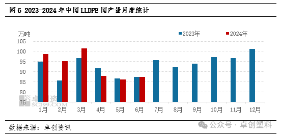 据卓创资讯数据统计,2024年上半年国内石化LLDPE累计产量预计在557.12万吨,较去年上半年环比增加2.56%。主要受2023年新投产装置产量释放的影响,一季度各月份产量均高于去年同期,增幅在3.86万-9.44万吨不等,其中3月份产量达到上半年最高点在101.46万吨;但进入二季度,部分LLDPE装置进入集中检修期,损失量有所增加,达到50.5万吨,较去年同期增加7.42%,6月份损失量达到上半年高点在18.74万吨,处于偏高水平,因此PE产量相应下降,尤其4月和5月份LLDPE产量明显下降,5月份产量处于上半年最低点在86.24万吨。