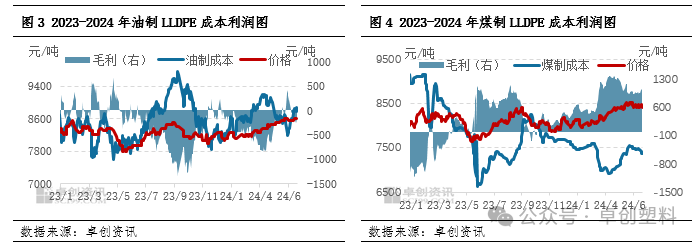 2024年上半年国内LLDPE价格整体呈弱势震荡后逐渐拉涨,不同生产路径企业成本涨跌不一,转换到毛利也呈现涨跌不一走势。卓创资讯LLDPE利润模型显示,2024年上半年油制、煤制工艺利润分别在-294元/吨、876元/吨,较去年上半年相比,油制毛利亏损扩大,煤制毛利由亏转盈。油制企业长期亏损生产局面下,开工提升意愿不强,挺价意向明显。