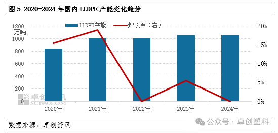 近年来,LLDPE产品在经历了2020-2021年集中扩能周期之后,中国LLDPE产能扩能速度逐步放缓,增长率呈下降的趋势。2024年上半年LLDPE装置暂无新增投产装置,目前产能维持在1058.8万吨,据卓创资讯统计,下半年天津石化二期(南港)项目、山东某企业、裕龙岛石化和内蒙古宝丰一期项目计划投产,但考虑到实际运行情况,新装置投产存在延迟的可能,产量释放或将有限。