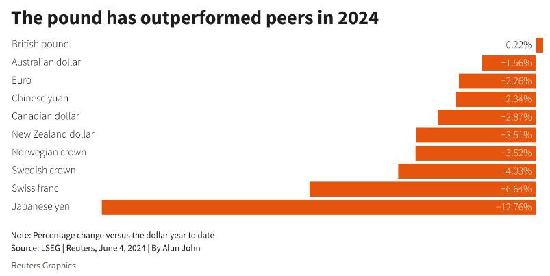 英镑的复苏受到以下因素的支撑:英国经济表现好于担忧;相对于欧洲其他国家,英国央行对降息持谨慎态度;人们希望工党在大选中轻松获胜,将带来更大程度的政治和经济稳定。"如果投资者继续认为不太可能大幅增税,工党希望通过说服投资者回到英国来刺激经济增长,我们可能会看到英镑温和反弹,"Foley表示。