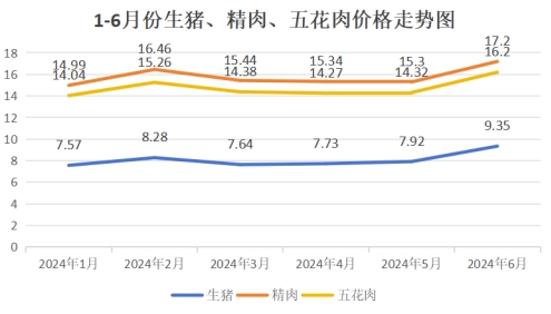 监测数据显示,全市集贸市场生猪(中等)均价为8.34元/500克,环比上涨6.24%;月均价分别为4月7.73元/500克、5月7.92元/500克、6月9.35元/500克,本季度精瘦肉均价为15.95元/500克,环比上涨1.85%,月均价分别为4月15.34元/500克、5月15.30元/500克、6月17.20元/500克;五花肉均价为14.94元/500克,环比上涨2.40%,月均价分别为4月14.27元/500克、5月14.32元/500克、6月16.20元/500克。