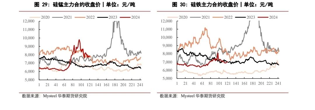 硅铁方面,昨日硅铁期货价格整体维持震荡走势,硅铁2409合约收于7018元/吨,较上个交易日上涨8元/吨,涨幅0.11%。现货方面,主产区72硅铁自然块现金含税出厂6600-6750元/吨,75硅铁自然块7000-7200元/吨。供应端,市场处于缓慢去库状态,个别厂家再次进入亏损局面,直接抑制了生产的积极性,后期对硅铁产量存减弱预期。但需求端来看,钢厂复产已接近尾声,消费淡季到来,使得硅铁需求预期转弱。整体来看,硅铁基本面情况变化不大,多空博弈下预计短期价格维持震荡运行,后续需关注钢厂采购及硅铁去库速率的变化情况。