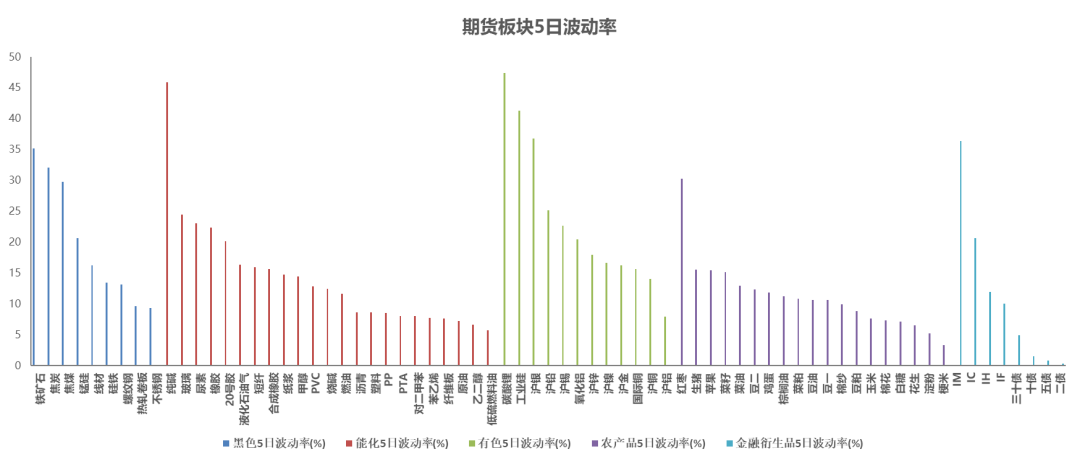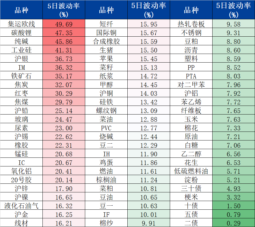 从5日波动率水平看,前三位为集运欧线、碳酸锂和纯碱;低波动前三品种为二债、五债和十债。